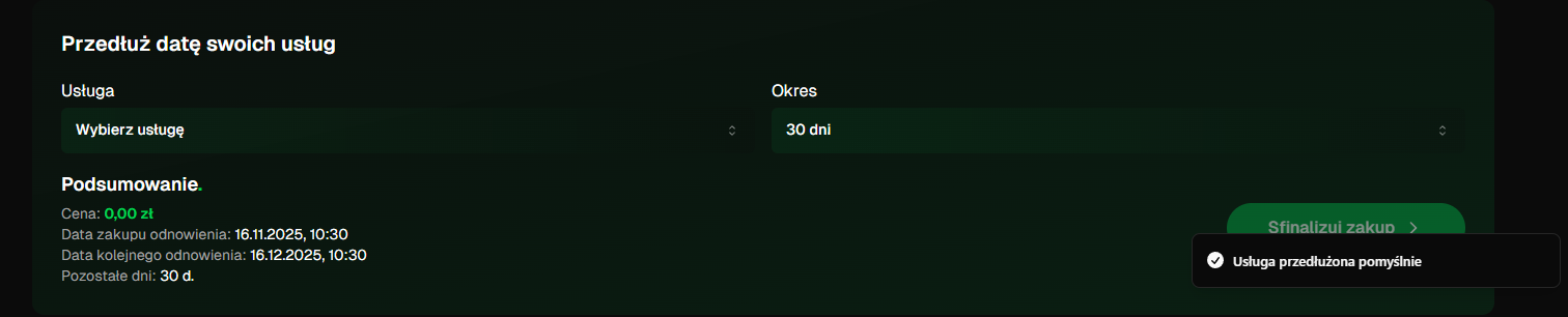 W panelu przejdź do sekcji „Przedłuż datę swoich usług” i wybierz usługę, którą chcesz przedłużyć.